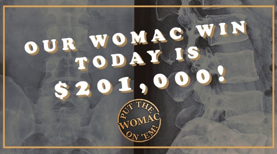 We recently represented a client who was injured in a rear-end motor vehicle collision. She suffered herniated discs in her lower back. She underwent lumbar facet joint injections and a lumbar endoscopic rhizotomy. We put the Womac on em and recovered $201,000.