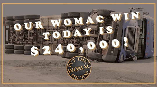 We recently represented a client who was injured in a collision with an 18 wheeler. She sustained neck and back injuries including herniated discs in her back. She underwent lumbar facet and medial branch blocks, lumbar rhizotomies, and lumbar discography with a stem cell injection. We put the Womac on em and recovered $240,000.